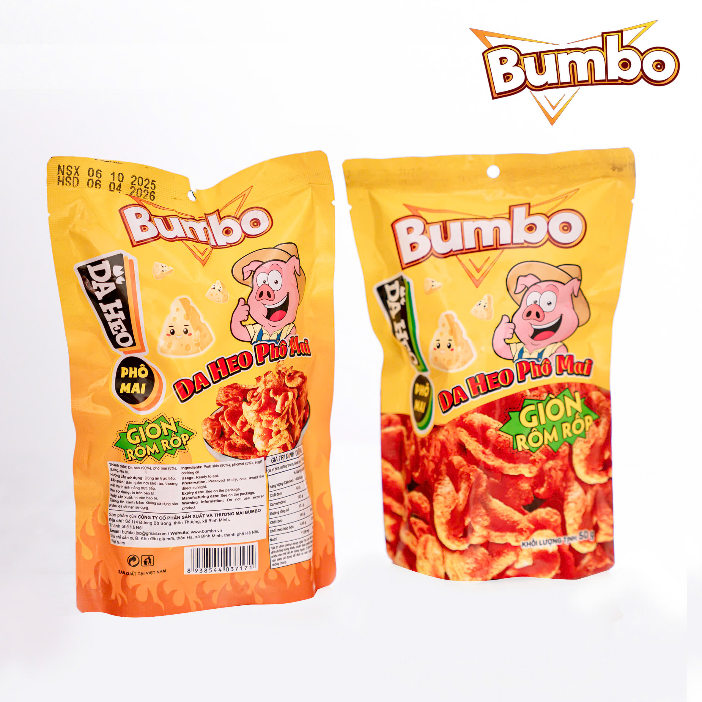 Da heo phô mai Bumbo được làm từ nguyên liệu tóp mỡ tươi với tỏi chiên thơm lừng, quy trình sản xuất sạch sẽ, bao bì gọn gàng với dạng gói zip 50gr tiện lợi.